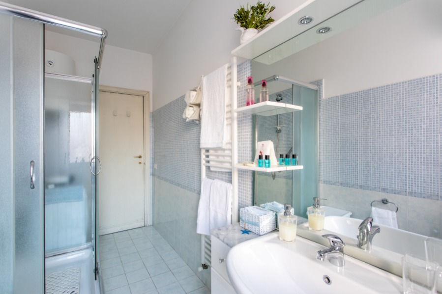 The bathroom has a large shower and is equipped with everything you need, including towels for all guests and a hairdryer.