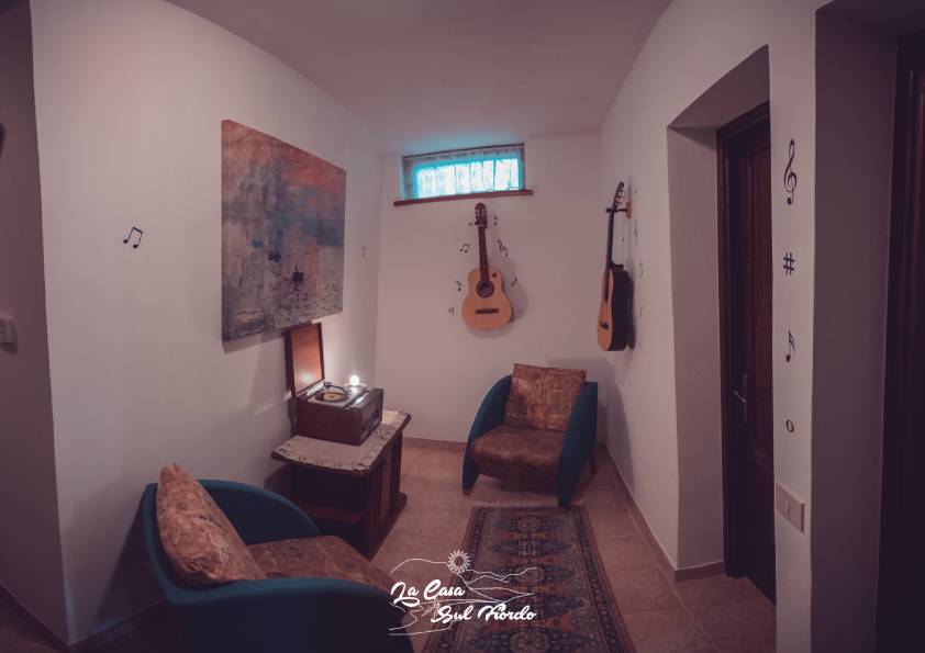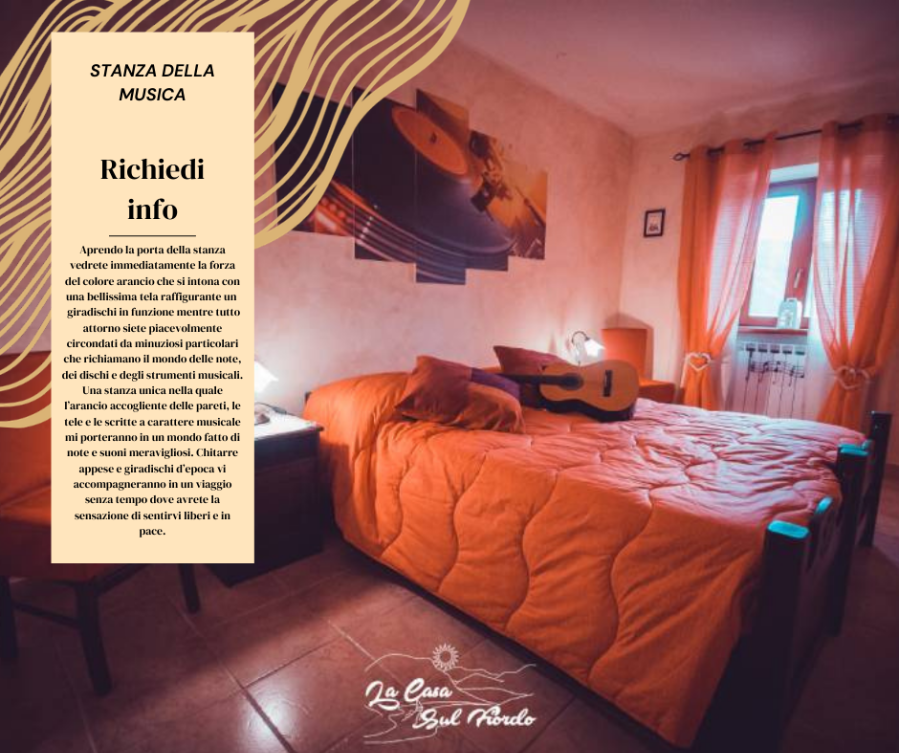 Una stanza unica nella quale l’arancio accogliente delle pareti, le tele e le scritte a carattere musicale mi porteranno in un mondo fatto di note e suoni meravigliosi. Chitarre appese e giradischi d’epoca vi accompagneranno in un viaggio senza tempo dove avrete la sensazione di sentirvi liberi e in pace.