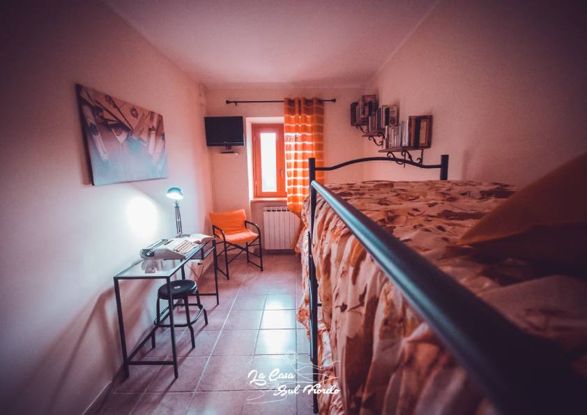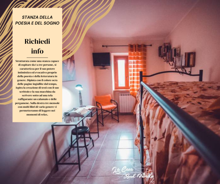 Una stanza nella quale il colore delle pareti ricorda quello delle pagine ingiallite dei libri nelle biblioteche. Con una vista invidiabile sul lago, una macchina da scrivere e dei libri disponibili da leggere potrete fare del vostro soggiorno un momento di relax e di riflessione magari anche per scrivere un pensiero o leggere il vostro libro preferito in totale silenzio.
